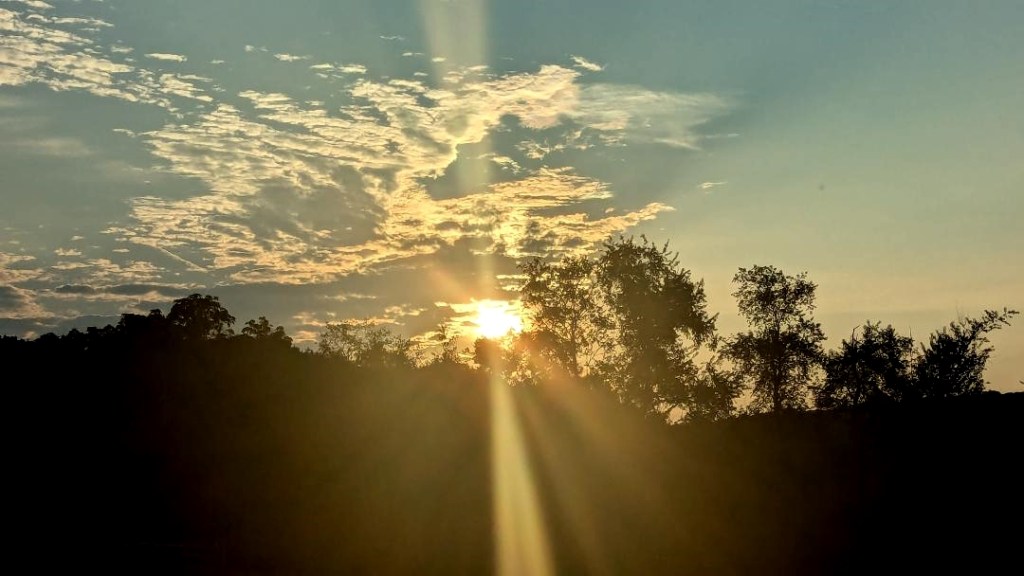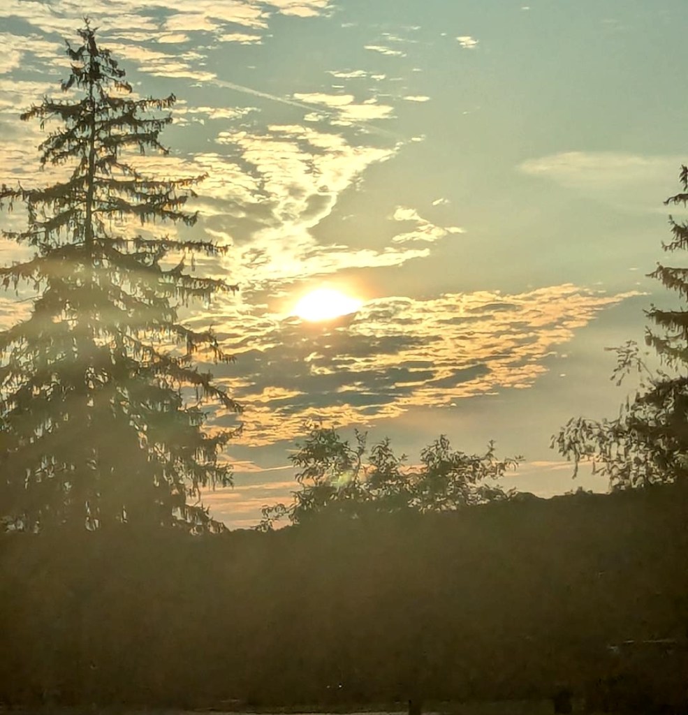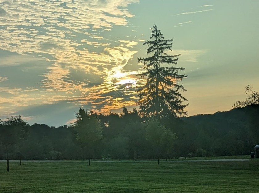 I love seeing the early morning sunrise, especially when the sky is partly cloudy. This morning, the sun’s rays beam a beautiful glow on the clouds while at the same time creating a somewhat eerie contrast of light and dark areas. And, what’s cool is that as I walk farther down the hill toward the woods, the tall trees block the sun, so I can watch it rise again over the treetops. In fact, I can view multiple rises on the same walk.