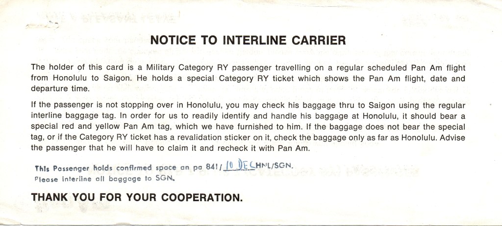 Nine months into my tour, I had accumulated some leave time and was also entitled to a 7-day R&R as well. We had the option of going to Thailand, Japan, Australia, Hawaii, and maybe some other places that I can’t remember now. Even though I didn’t include any mention of the R&R trip in my memoir, I may still write about it someday. But for now, I thought I would just post pictures of my flight ticket that I found while going through some old files. The first picture below is the fifty plus year old Pan Am commercial 747 flight ticket. The additional pictures following the flight ticket picture are posted for their historical documentation value, if any.